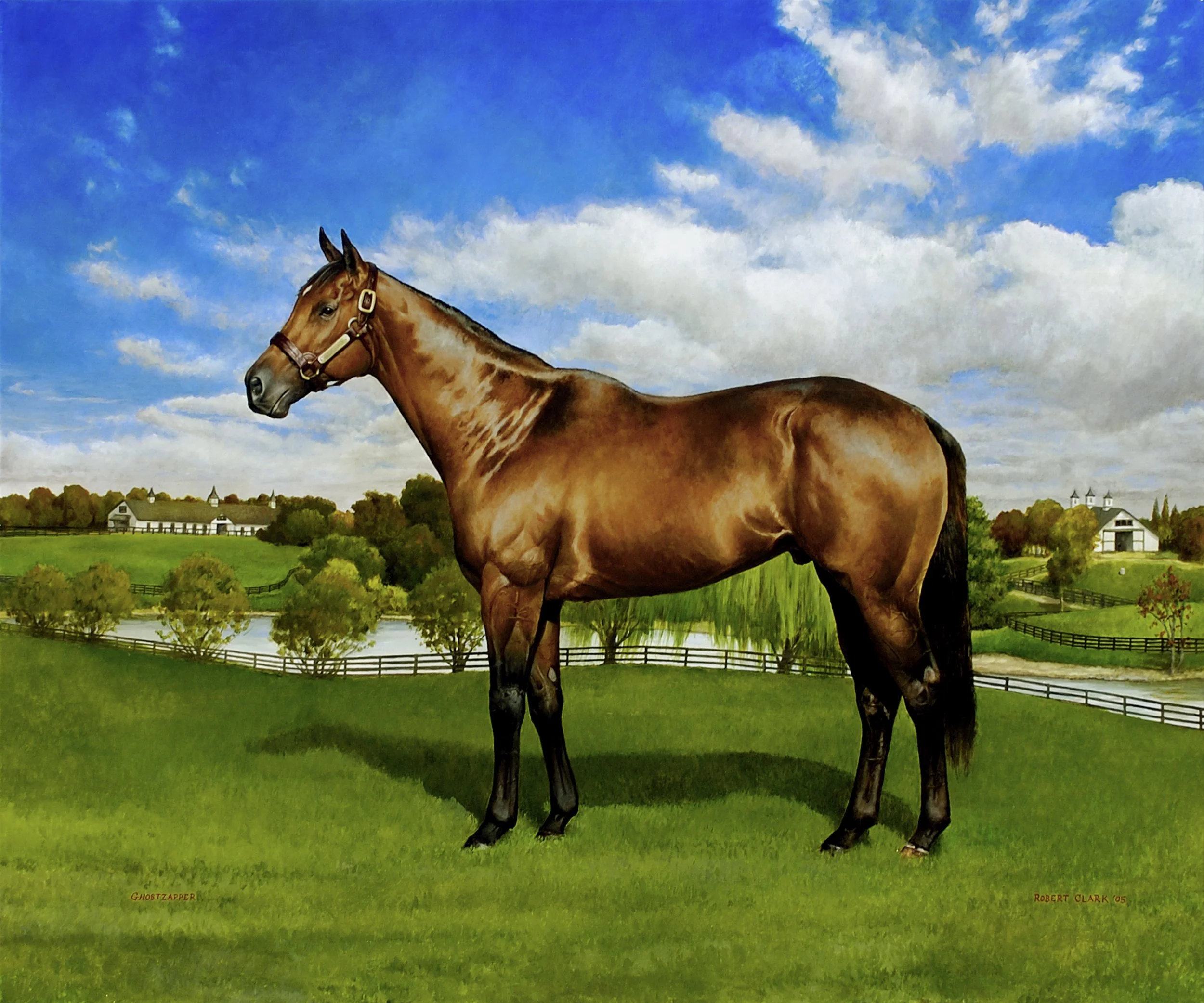 The first time I painted Ghostzapper, it was the Classic with Javier Castellano in the irons (trained by Bobby Frankel.) When Frank saw the painting, he smiled and told me that he wanted me to paint him again, this time with the legs and he wanted me to "paint him the way Richard Stone Reeves does it." Having been to Adena Springs in both Kentucky and Florida, you see the other conformation paintings of Frank's stallions by Reeves. I know Adena Springs in Kentucky is for sale, but the conformation painting of Ghostzapper still greets you when you enter the massive office.