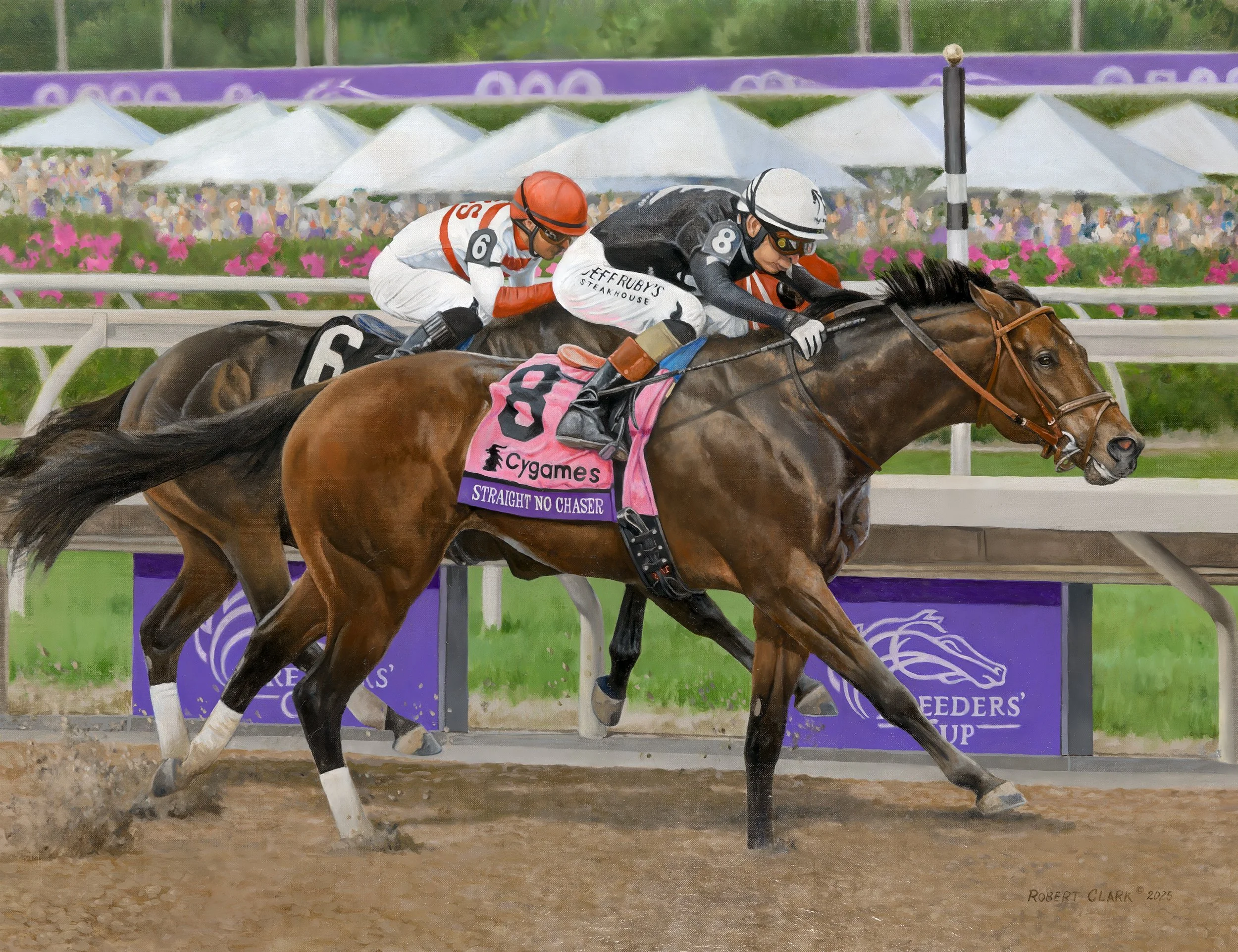 The print will be on high quality art paper. The image itself will be approximately 19x28 inches with a border, making the entire dimensions 23 x 29 inches image size is subject to change based on the painters discretion. The print will include a body of text below the image featuring the horses details including the horses name, jockey, and trainer to name a few. These will be numbered and autographed by the artist.